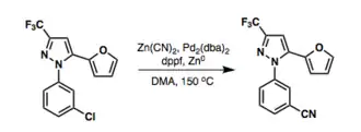 - ↑ Cohen, Daniel (2015). "Mild Palladium-Catalyzed Cyanation of (Hetero)aryl Halides and Triflates in Aqueous Media". Organic Letters. 17 (2): 202–205. doi:10.1021/ol5032359. PMC 4301087. PMID 25555140.