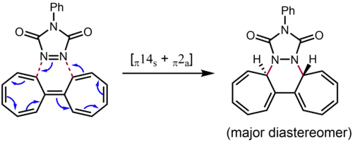 Doering (in a personal communication to Woodward) reported that heptafulvalene and tetracyanoethylene can react in a suprafacial-antarafacial [14 + 2]-cycloaddition. However, this reaction was later found to be stepwise, as it also produced the Woodward-Hoffmann forbidden suprafacial-suprafacial product under kinetic conditions. [3]