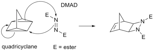 Some cycloadditions instead of π bonds operate through strained cyclopropane rings, as these have significant π character. For example, an analog for the Diels-Alder reaction is the quadricyclane-DMAD reaction: