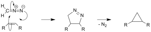 Certain diazo compounds, such as diazomethane, can react with olefins to produce cyclopropanes in a 2 step manner. The first step involves a 1,3-dipolar cycloaddition to form a pyrazoline which then undergoes denitrogenation, either photochemically or by thermal decomposition, to give cyclopropane. The thermal route, which often uses KOH and platinum as catalysts, is also known as the Kishner cyclopropane synthesis after the Russian chemist Nikolai Kischner[7][8] and can also be performed using hydrazine and α,β-unsaturated carbonyl compounds.[9] The mechanism of decomposition has been the subject of several studies and remains somewhat controversial, although it is broadly thought to proceed via a diradical species.[10][11] In terms of green chemistry this method is superior to other carbene based cyclopropanations; as it does not involve metals or halogenated reagents, and produces only N2 as a by-product. However the reaction can be dangerous as trace amounts of unreacted diazo compounds may explode during the thermal rearrangement of the pyrazoline.