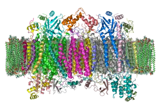 ![]() The crystal structure of bovine cytochrome c oxidase in a phospholipid bilayer. The intermembrane space lies to top of the image. Adapted from PDB: 1OCC (It is a homodimer in this structure) | |||||||||