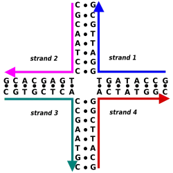The complexes constructed in structural DNA nanotechnology use topologically branched nucleic acid structures containing junctions. (In contrast, most biological DNA exists as an unbranched double helix.) One of the simplest branched structures is a four-arm junction that consists of four individual DNA strands, portions of which are complementary in a specific pattern. Unlike in natural Holliday junctions, each arm in the artificial immobile four-arm junction has a different base sequence, causing the junction point to be fixed at a certain position. Multiple junctions can be combined in the same complex, such as in the widely used double-crossover (DX) structural motif, which contains two parallel double helical domains with individual strands crossing between the domains at two crossover points. Each crossover point is, topologically, a four-arm junction, but is constrained to one orientation, in contrast to the flexible single four-arm junction, providing a rigidity that makes the DX motif suitable as a structural building block for larger DNA complexes.[3][5]