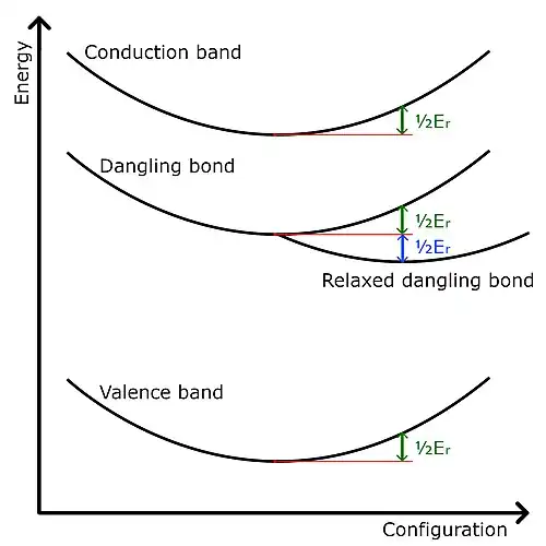 A dangling bond adds an extra energy level between the valence band and conduction band of a lattice. This allows for absorption and emission at longer wavelengths, because electrons can take smaller energy steps by moving to and from this extra level. The energy of the photons absorbed by or emitted from this level is not exactly equal to the energy difference between the bottom of the conduction band and the dangling bond or the top of the valence band and the dangling bond. This is due to lattice relaxation which causes a Franck-Condon shift in the energy. This shift accounts for the difference between a tight-binding calculation of these energy differences and the experimentally measured energies.[2]