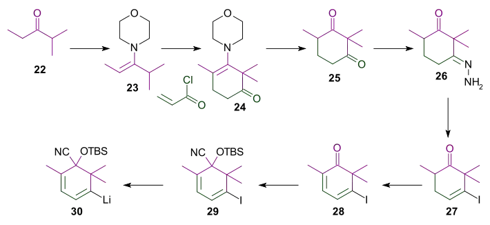 For this synthesis (Scheme 3) the morpholine enamine of ethyl isopropyl ketone was treated with acryloyl chloride to give after hydrolysis diketone 25. Reaction with hydrazine in triethylamine and ethanol afforded hydrazone 26. After an unusual hydrazone iodination that also involved iodination alpha to a carbonyl group and elimination of HI, fully conjugated vinyl iodide 28 was produced in an unexpected dehydrogenation. The ketone was converted into cyanohydrin 29 with trimethylsilyl cyanide, potassium cyanide and a crown ether.