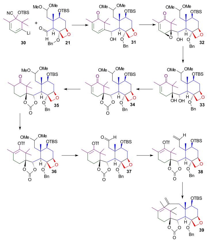 Taxol resulted from the tail addition of the Ojima lactam to alcohol 51, which is baccatin III (the original target molecule of the Danishefsky synthesis). Alcohol 51 was derived from the allylic oxidation of α-acylketone 49. Compound 49 was ultimately derived from the Heck reaction of enol triflate 38, which was used to close the B-ring. Enol triflate 38 resulted from a rearrangement of compound 31 after protection of its hydroxyl group. Compound 31 was derived from the connection of the A and C rings with aldehyde 21 combining with the vinyllithium reagent derived from cyanohydrin 29. Cyanohydrin 29 originated as the ethyl isopropyl ketone (22). Aldehyde 21 was obtained from compound 17, which was the product of the opening of ketal 12. Ketal 12 was ultimately derived from the Wieland-Miescher ketone (1).
