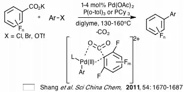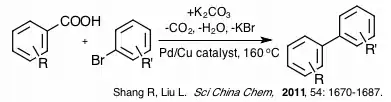 - ↑ Goossen LJ, Rodríguez N, Melzer B, Linder C, Deng GJ, Levy LM. Biaryl synthesis via Pd-catalyzed decarboxylative coupling of aromatic carboxylates with aryl halides. J Am Chem Soc, 2007, 129: 4824–33 DOI: 10.1021/ja068993+