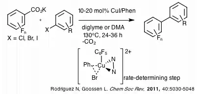 A Pd–Cu bimetallic system was not discovered until 2006 when Goossen et al. reported a decarboxylative cross-coupling of aryl halides with ortho-substituted aromatic carboxylic acids.[14] Through subsequent studies it was found that the use of aryl triflates allowed substrate scope for cross-coupling to be extended to some aromatic carboxylates lacking any ortho-substitution (less reactive). This was a result of the fact that any halide anion generated in the reaction inhibited the Cu-catalyzed decarboxylation process.[15] Further optimization of the system and catalyst conditions has made decarboxylative cross-coupling using bimetallic Pd–Cu systems applicable to organic synthesis, most predominantly in the formation of biaryls.[3] As well, the variability of this combined catalytic system allows for promotion of a large spectrum of reactions, including aryl ketone formation, c-heteroatom cross-coupling, and many others.[1]