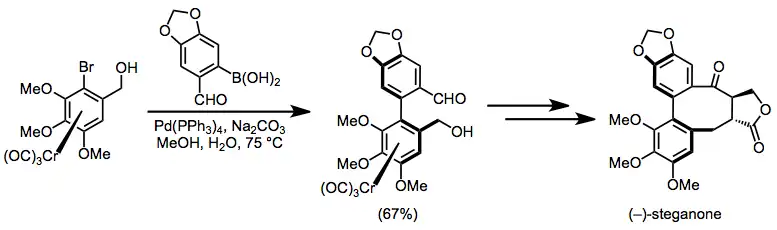 In this case Cr(CO)3(pyridine)3 can be recycled. Illustrative of this approach is the synthesis of (–)-steganone via a chromium haloarene complex. The synthesis is completed by decomplexation, liberating the natural product.[2]
