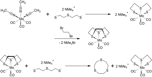 1,4,7-Trithiacyclononane can be prepared within the coordination sphere of a metal, and then isolated by decomplexation.[3]