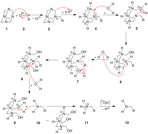 The benzyl halide or alkyl halide 1 reacts with hexamethylenetetramine to a quaternary ammonium salt 3, each time just alkylating one nitrogen atom. By refluxing in concentrated ethanolic hydrochloric acid solution this salt is converted to the primary amine together with formaldehyde (as the acetal with ethanol) and ammonium chloride.