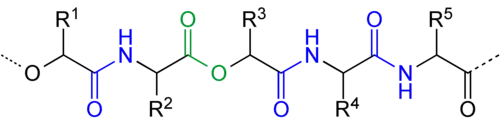 - ↑ IUPAC, Compendium of Chemical Terminology, 2nd ed. (the "Gold Book") (1997). Online corrected version: (2006–) "depsipeptides". doi:10.1351/goldbook.D01604