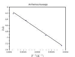Due to improvement in computational power, there are now several ways to perform thermal desorption analysis without assuming independence of the rate constant and activation energy.[3] For example, the "complete analysis" method[6] uses a family of desorption curves for several different surface coverages and integrates to obtain coverage as a function of temperature. Next, the desorption rate for a particular coverage is determined from each curve and an Arrhenius plot of the logarithm of the rate of desorption against 1/T is made. An example of an Arrhenius plot can be seen in the figure on the right. The activation energy can be found from the gradient of this Arrhenius plot.[7]