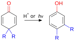 The dienone–phenol rearrangement[1] is a reaction in organic chemistry first reported in 1921 by Karl von Auwers and Karl Ziegler. A common example of dienone–phenol rearrangement is 4,4-disubstituted cyclohexadienone converting into a stable 3,4-disubstituted phenol in presence of acid. A similar rearrangement is possible with a 2,2-disubstituted cyclohexadienone to its corresponding disubstituted phenol. Usually this type of rearrangement is spontaneous unless a dichloromethyl group is present at the 4th position or the process is otherwise blocked.[2]