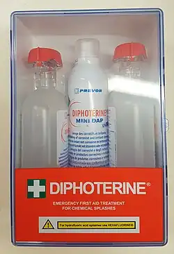 Diphoterine is a decontamination solution used in first aid for the emergency treatment of chemical spills to the eyes and body.