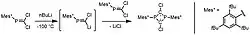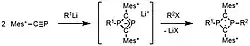 Another synthetic route was developed by Yoshifuji and Ito to access a wider variety of substituents at phosphorus (Figure 7).[24] 2 equivalents of Mes*-substituted phosphaalkyne can be reacted with the lithiated compound of the first substituent on phosphorus, forming the anionic [P2C2] four-membered ring. This intermediate can then be alkylated to attach the second phosphorus substituent. This two-step synthetic pathway allows for the synthesis of unsymmetrically substituted 1,3-diphospha-cyclobutane-2,4-diyls. The substituents on carbon are limited to Mes*, however, due to the limitation of the phosphaalkyne starting material. Most diradicaloids of this type can be handled in air and display high kinetic stability due to the steric protection provided by the Mes* substituents on the carbon radical centers.