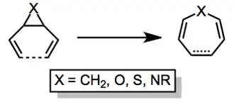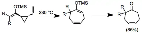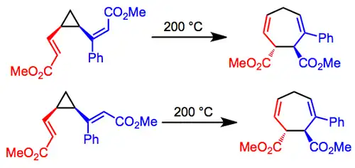 The divinylcyclopropane-cycloheptadiene rearrangement is an organic chemical transformation that involves the isomerization of a 1,2-divinylcyclopropane into a cycloheptadiene or -triene. It is conceptually related to the Cope rearrangement, but has the advantage of a strong thermodynamic driving force due to the release of ring strain. This thermodynamic power is recently being considered as an alternative energy source.[1]