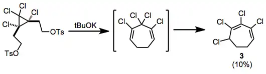 Rearrangement after elimination of ditosylates has been observed; the chlorinated cycloheptadiene thus produced isomerizes to conjugated heptadiene 3 during the reaction.[10]