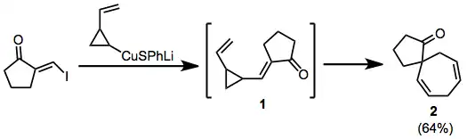 In the example below, cuprate addition-elimination generates the transient enone 1, which rearranges to spirocycle 2.