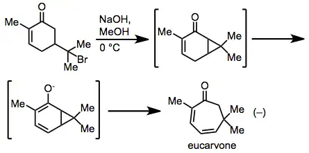 The earliest observation of a cycloheptadiene via the title rearrangement was made by Adolf von Baeyer in his synthesis of eucarvone from carvone hydrobromide.[17] Mechanistic studies revealed that the rearrangement did indeed proceed via a concerted, Cope-type mechanism.[18]