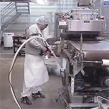 Dry-ice blasting can be used to clean food processing equipment.[11] As early as 2004, the UK Food Standards Agency documented the process to effectively decontaminate surfaces of Salmonella enteritidis, E. coli, and Listeria monocytogenes such that these microorganisms are not detectable using conventional microbiological methods.[12] "As a result of two outbreaks salmonellosis associated with the consumption of peanut butter and baby food in 2006–2007,[13][14] an effort was taken" by GMA members such as Cargill "to reassess industry practices for eliminating salmonella in low-moisture products" because "Salmonella outbreaks from low-moisture products are relatively rare but often impact large numbers of people." A document resulted from this effort describing a variety of waterless cleaning methods,[15] including dry-ice blasting.