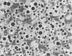 Ductile iron is not a single material but part of a group of materials which can be produced with a wide range of properties through control of their microstructure. The common defining characteristic of this group of materials is the shape of the graphite. In ductile irons, graphite is in the form of nodules rather than flakes as in grey iron. Whereas sharp graphite flakes create stress concentration points within the metal matrix, rounded nodules inhibit the creation of cracks, thus providing the enhanced ductility that gives the alloy its name.[5] Nodule formation is achieved by adding nodulizing elements, most commonly magnesium (magnesium boils at 1100 °C and iron melts at 1500 °C) and, less often now, cerium (usually in the form of mischmetal).[6] Tellurium has also been used. Yttrium, often a component of mischmetal, has also been studied as a possible nodulizer.