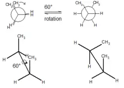 If the front is rotated 60° clockwise, the butane molecule is now in a staggered conformation (right). This conformation is more specifically referred to as the gauche conformation of butane. This is due to the fact that the methyl groups are staggered, but only 60° from one another. This conformation is more energetically favored than the eclipsed conformation, but it is not the most energetically favorable conformation. Another 60° rotation gives us a second eclipsed conformation where both methyl groups are aligned with hydrogen atoms. One more 60 rotation produces another staggered conformation referred to as the anti conformation. This occurs when the methyl groups are positioned opposite (180°) of one another. This is the most energetically favorable conformation. [3]