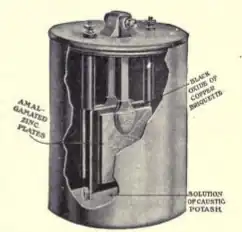 The Edison–Lalande cell was a type of alkaline primary battery developed by Thomas Edison from an earlier design by Felix Lalande and Georges Chaperon.[1][2] It consisted of plates of copper oxide and zinc in a solution of potassium hydroxide. The cell voltage was low (about 0.75 volts) but the internal resistance was also low so these cells were capable of delivering large currents.[3] The cell could be replenished with fresh zinc and copper oxide plates and KOH solution for reuse.