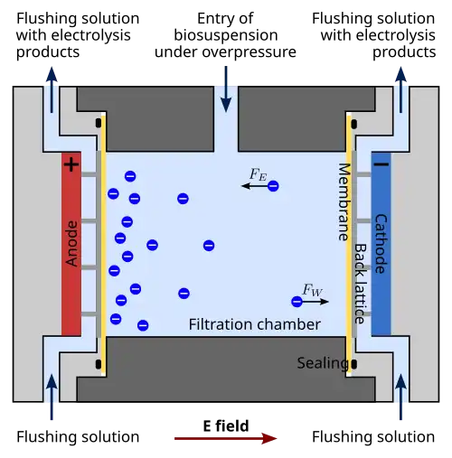 - ↑ Hofmann R., Posten C. (2003). "Improvement of dead-end filtration of biopolymers with pressure electrofiltration". Chemical Engineering Science. 58 (17): 3847–3858. Bibcode:2003ChEnS..58.3847H. doi:10.1016/S0009-2509(03)00271-9.