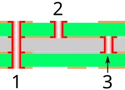 Electroless copper plating is used in the manufacture of printed circuit boards (PCBs), in particular for the conductive layer on the walls of through holes and vias.[3]