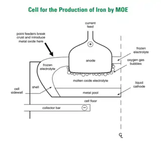 Molten Oxide Electrolysis in steelmaking is utilizing electrons as the reducing agent instead of coke as in conventional blast furnace. For steel production, this method uses an inert anode (Carbon, Platinum, Iridium or Chromium-based alloy)[4] and places iron ore in the cathode. The electrochemical reaction in this Molten Oxide cell can reach up to 1600 °C, a temperature that melts iron ore and electrolyte oxide.[5] Then the molten iron ore decompose following this reaction:[6]