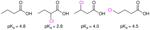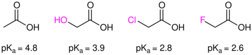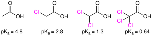 Electron-withdrawing groups exert an "inductive" or "electron-pulling" effect on covalent bonds. The strength of the electron-withdrawing group is inversely proportional to the pKa of the carboxylic acid.[2]
