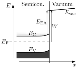 In the field of solid state physics, the electron affinity is defined differently than in chemistry and atomic physics. For a semiconductor-vacuum interface (that is, the surface of a semiconductor), electron affinity, typically denoted by EEA or χ, is defined as the energy obtained by moving an electron from the vacuum just outside the semiconductor to the bottom of the conduction band just inside the semiconductor:[6]