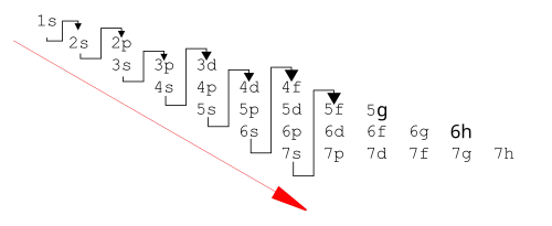 - 1s, 2s, 2p, 3s, 3p, 4s, 3d, 4p, 5s, 4d, 5p, 6s, 4f, 5d, 6p, 7s, 5f, 6d, 7p, (8s, 5g, 6f, 7d, 8p, and 9s)