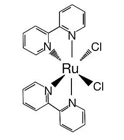 RuCl2(bpy)2 is an octahedral metal complex with two bidentate 2,2′-Bipyridine (bpy) ligands and two chloride ligands.
