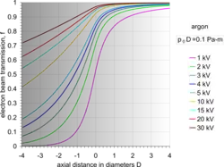 By the use of differential pumping, an electron beam is generated and propagated freely in the vacuum of the upper column, from the electron gun down to PLA2, from which point onwards the electron beam gradually loses electrons due to electron scattering by gas molecules. Initially, the amount of electron scattering is negligible inside the intermediate cavity, but as the beam encounters an increasingly denser gas jet formed by the PLA1, the losses become significant.[29] After the beam enters the specimen chamber, the electron losses increase exponentially at a rate depending on the prevailing pressure, the nature of gas and the acceleration voltage of the beam. The fraction of beam transmitted along the PLA1 axis can be seen by a set of characteristic curves for a given product p0D,[29] where D is the aperture diameter. Eventually, the electron beam becomes totally scattered and lost, but before this happens, a useful amount of electrons is retained in the original focused spot over a finite distance, which can still be used for imaging. This is possible because the removed electrons are scattered and distributed over a broad area like a skirt (electron skirt) surrounding the focused spot.[34] Because the electron skirt width is orders of magnitude greater than the spot width, with orders of magnitude less current density, the skirt contributes only background (signal) noise without partaking in the contrast generated by the central spot. The particular conditions of pressure, distance and beam voltage over which the electron beam remains useful for imaging purposes has been termed oligo-scattering regime[35] in distinction from single-, plural- and multiple-scattering regimes used in prior literature.