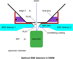Despite the above developments, devoted BSE detectors in the ESEM have played an important role, since the BSE remain a useful detection mode yielding information not possible to obtain with SE. The conventional BSE detection means have been adapted to operate in the gaseous conditions of the ESEM. The BSE having a high energy are self-propelled to the corresponding detector without significant obstruction by the gas molecules. Annular or quadrant solid-state detectors have been employed for this purpose but their geometry is not easily adaptable to the requirements of ESEM for optimum operation. As a result, no much use has been reported of these detectors on genuine ESEM instruments at high pressure. The "Robinson" BSE detector[40] is tuned for operation up to around 100 Pa at the usual working distance of conventional SEM for the suppression of specimen charging, whilst electron collection at the short working distance and high pressure conditions make it inadequate for the ESEM. However, plastic scintillating materials being easily adaptable have been used for BSE and made to measure according to the strictest requirements of the system. Such work culminated in the use of a pair of wedge-shaped detectors saddling a conical PLA1 and abutting to its rim, so that the dead detection space is reduced to a minimum, as shown in the accompanying figure of optimum BSE detectors.[14] The photon conduction is also optimized by the geometry of the light pipes, whilst the pair of symmetrical detectors allow the separation of topography (signal subtraction) and atomic number contrast (signal addition) of the specimen surface to be displayed with the best ever signal-to-noise-ratio. This scheme has further allowed the use of color by superimposing various signals in a meaningful way.[43] These simple but special detectors became possible in the conditions of ESEM, since bare plastic does not charge by the BSE. A very fine wire mesh with appropriate spacing has been proposed[44] as a GDD when gas is present and to conduct negative charge away from the plastic detectors when the gas is pumped out, towards a universal ESEM. Since the associated electronics involve a photomultiplier with a wide frequency response, true TV scanning rates are available. This is an attribute to maintain with an ESEM that enables the examination of processes in situ in real time.[37][45] In comparison, no such imaging has been \ reported with the electron avalanche mode of the GDD yet (as of March, 2025).