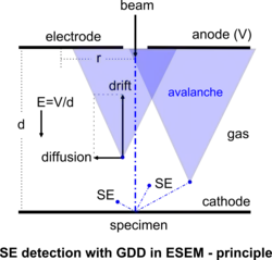 BSE pass through the gaseous volume between the electrodes of the GDD and generate additional ionization and avalanche amplification. There is an inner volume where the secondary electrons dominate with small or negligible BSE contribution, whilst the outer gaseous volume is acted upon mainly by the BSE. It is possible to separate the corresponding detection volumes so that near pure BSE images can be made with the GDD. The relationship of relative strength of the two signals, SE and BSE, has been worked out by detailed equations of charge distribution in the ESEM.[41] The analysis of plane electrodes is essential in understanding the principles and requirements involved and by no means indicate the best choice of electrode configuration, as discussed in the published theory of the GDD.[17][42]