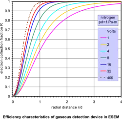 In a simple form, the gaseous detection device (GDD) employs an electrode with a voltage up to several hundred volts to collect the secondary electrons in the ESEM. The principle of this SE detector is best described by considering two parallel plates at a distance d apart with a potential difference V generating a uniform electric field E = V/d, and is shown in the accompanying diagram of the GDD.[17][27] Secondary electrons released from the specimen at the point of beam impingement are driven by the field force towards the anode electrode but the electrons also move radially due to thermal diffusion from collisions with the gas molecules. The variation of electron collection fraction R within anode radius r vs. r/d, for fixed values of anode bias V, at constant product of (pressure·distance) p·d = 1 Pa·m, is given by the accompanying characteristic curves of efficiency of the GDD. All of the secondary electrons are detected if the parameters of this device are properly designed. This clearly shows that practically 100% efficiency is possible within a small radius of collector electrode with only moderate bias. At these levels of bias, no catastrophic discharge takes place. Instead, a controlled proportional multiplication of electrons is generated as the electrons collide with gas molecules releasing new electrons on their way to the anode. This principle of avalanche amplification operates similarly to proportional counters used to detect high energy radiation. The signal thus picked up by the anode is further amplified and processed to modulate a display screen and form an image as in SEM. Notably, in this design and the associated gaseous electron amplification, the product p·d is an independent parameter, so that there is a wide range of values of pressure and electrode geometry which can be described by the same characteristics. The consequence of this analysis is that the secondary electrons are possible to detect in a gaseous environment even at high pressures, depending on the engineering efficacy of any given instrument.[17]
