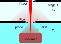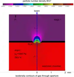 The specimen chamber sustaining the high-pressure gaseous environment is separated from the high vacuum of the electron optics column with at least two small orifices customarily referred to as pressure-limiting apertures (PLA). The gas leaking through the first aperture (PLA1) is quickly removed from the system with a pump that maintains a much lower pressure in the downstream region (i.e. immediately above the aperture).[14] This is called differential pumping. Some gas escapes further from the low pressure region (stage 1) through a second pressure limiting aperture (PLA2) into the vacuum region of the column above, which constitutes a second stage differential pumping (stage 2). A schematic diagram shows the basic ESEM gas pressure stages including the specimen chamber, intermediate cavity and upper electron optics column.[27] The corresponding pressures achieved are p0>>p1>>p2, which is a sufficient condition for a microscope employing a tungsten type of electron gun. Additional pumping stages may be added to achieve an even higher vacuum as required for a LaB6 and field emission type electron guns. The design and shape of a pressure limiting aperture are critical in obtaining the sharpest possible pressure gradient (transition) through it. This is achieved with an orifice made on a thin plate and tapered in the downstream direction as shown in the accompanying isodensity contours of a gas flowing through the PLA1. This was done with a computer simulation of the gas molecule collisions and movement through space in real time.[28][29] We can immediately see in the figure of the isodensity contours of gas through aperture that the gas density decreases by about two orders of magnitude over the length of a few aperture radii. This is a quantitatively vivid demonstration of a first principle that enables the separation of the high-pressure specimen chamber from the low pressure and vacuum regions above.