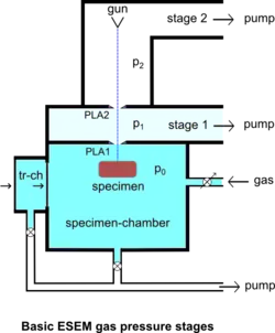 The majority of available instruments vent their specimen chamber to the ambient pressure (100 kPa) with every specimen transfer. A large volume of gas has to be pumped out and replaced with the gas of interest, usually water vapor supplied from a water reservoir connected to the chamber via some pressure regulating (e.g. needle) valve. In many applications this presents no problem, but with those ones requiring uninterrupted 100% relative humidity, it has been found that the removal of ambient gas is accompanied by lowering the relative humidity below the 100% level during specimen transfer.[61] This clearly defeats the very purpose of ESEM for this class of applications. However, such a problem does not arise with the original prototype ESEM using an intermediate specimen transfer chamber, so that the main chamber is always maintained at 100% relative humidity without interruption during a study.[62] The specimen transfer chamber (tr-ch) shown in the diagram of ESEM gas pressure stages contains a small water reservoir so that the initial ambient air can be quickly pumped out and practically instantaneously replaced with water vapor without going through a limited conductance tube and valve. The main specimen chamber can be maintained at 100% relative humidity, if the only leak of vapor is through the small PLA1, but not during violent pumping with every specimen change. Once the wet specimen is in equilibrium with 100% relative humidity in the transfer chamber, within seconds, a gate valve opens and the specimen is transferred in the main specimen chamber maintained at the same pressure. An alternative approach involving controlled pumping of the main chamber[61] may not solve the problem entirely either because the 100% relative humidity cannot be approached monotonically without any drying, or the process is very slow; inclusion of a water reservoir inside the main chamber means that one cannot lower the relative humidity until after all of the water is pumped out (i.e. a defective control of the relative humidity). See "Operation" on page 238 of the ESEM Foundations.[63]