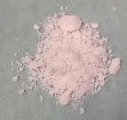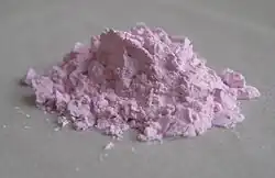 Erbium(III) oxide (also known as erbia) is the only known oxide of erbium, first isolated by Carl Gustaf Mosander in 1843, and first obtained in pure form in 1905 by Georges Urbain and Charles James.[2] It has a cubic structure resembling the bixbyite motif. The Er3+ centers are octahedral.[3] The formation of erbium oxide is accomplished by burning erbium metal.[4] Erbium oxide is insoluble in water and soluble in mineral acids.