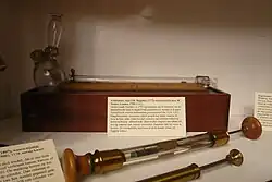 An electrified version of the eudiometer was developed by Count Alessandro Volta (1745–1827),[4] an Italian physicist who is well known for his contributions to the electric battery and electricity.[5] Aside from its laboratory function, the eudiometer is also known for its part in the "Volta pistol".[6] Volta invented this instrument in 1777 for the purpose of testing the "goodness" of air, analyzing the flammability of gases, or to demonstrate the chemical effects of electricity. Volta's Pistol had a long glass tube that was closed at the top, like a eudiometer. Two electrodes were fed through the tube and produced a spark gap inside the tube. Volta's initial use of this instrument concerned the study of swamp gases in particular. Volta's pistol was filled with oxygen and another gas. The homogeneous mixture was taped shut with a cork. A spark could be introduced into the gas chamber by electrodes, and possibly catalyze a reaction by static electricity, using Volta's electrophorus. If the gases were flammable, they would explode, and increase the pressure within the gas chamber. This pressure would be too great and eventually cause the cork to become airborne. Volta's pistol was made with either glass or brass, however due to the electricity the glass was vulnerable to exploding. Volta's extensive studies on measuring and creating high levels of electric currents caused the electrical unit, the volt, to be named after him.[7]