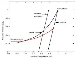 Explosive boiling can be best described by a pressure–temperature (p–T) phase diagram.[3] The figure on right shows a typical p–T phase diagram of a substance. The binodal line or the coexistence curve is a thermodynamic state where at that specific temperature and pressure, liquid and vapor can coexist. The spinodal line on right is the boundary of absolute instability of a solution to decomposition into multiple phases. A typical heating process is shown in red.