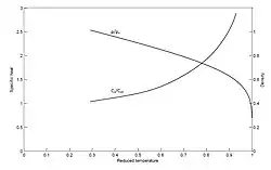 On the other hand, if the heating process is fast enough that the substance cannot reach the binodal curve through heterogeneous boiling, the liquid becomes superheated, with its temperature above boiling point at a given pressure. The system then shifts away from the binodal and continues to follow the red curve, thus approaching the spinodal. Near the critical temperature, thermodynamic properties like specific heat and density vary rapidly as shown in the figure at right. Density and entropy undergo the largest fluctuation. During this time, it is possible to have a large density fluctuation in a very small volume. This fluctuation of density results in the nucleation of a bubble. The bubble nucleation process occurs homogeneously everywhere in the substance. The rate of bubble nucleation and vapor sphere growth rate increases exponentially closer to the critical temperature. The increasing nucleation prevents the system from reaching the spinodal. When the bubble radius reaches a critical size, the bubbles continue to expand and eventually explode, resulting in a mixture of gas and droplets. This is the explosive boiling, also termed phase explosion.[4]