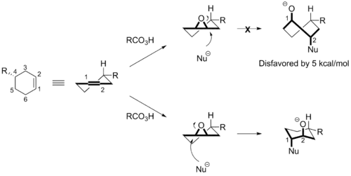 Epoxidation of a substituted cyclohexene affords a product where the R group resides in the pseudo-equatorial position. Nucleophilic ring-opening of this class of epoxides can occur by an attack at either the C1 or C2-position. It is well known that nucleophilic ring-opening reactions of these substrates can proceed with excellent regioselectivity. The Fürst-Plattner rule attributes this regiochemical control to a large preference for the reaction pathway that follows the more stable chair-like transition state (attack at the C1-position) compared to the one proceeding through the unfavored twist boat-like transition state (attack at the C2-position).[2][3] The attack at the C1-position follows a substantially lower reaction barrier of around 5 kcal mol–1 depending on the specific conditions. Similarly, the Fürst-Plattner rule applies to nucleophilic additions to imines and halonium ions.