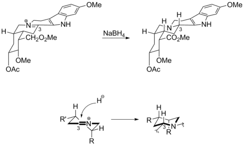 Examining the intermediate structure shows that the hydride preferentially added to the 3-carbon via the top face of the imine to avoid an unfavorable twist-boat intermediate. Unfortunately, this outcome required Woodward to perform several additional steps to complete the total synthesis of reserpine with the proper stereochemistry.