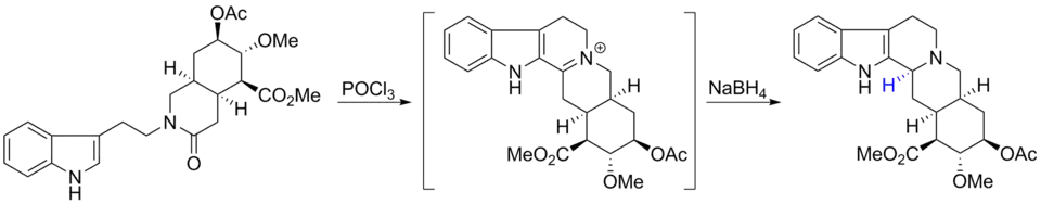 Woodward's synthetic strategy used a Bischler-Napieralski reaction to form the tetrahydrocarbazole portion of Reserpine. The subsequent imine intermediate was treated with sodium borohydride, affording the wrong stereoisomer due to the Fürst-Plattner effect.
