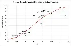 Although the bond in a compound like X+Y- may be considered to be 100% ionic, it will always have some degree of covalent character. When two oppositely charged ions (X+ and Y-) approach each other, the cation attracts electrons in the outermost shell of the anion but repels the positively charged nucleus. This results in a distortion, deformation or polarization of the anion. If the degree of polarization is quite small, an ionic bond is formed, while if the degree of polarization is large, a covalent bond results.[4]