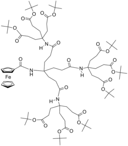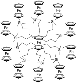 Ferrocene-containing dendrimers are dendrimers that contain ferrocene substituents. Some ferrocene-containing dendrimers feature ferrocene cores and others do not. All feature with peripheral ferrocene groups.[1][2]