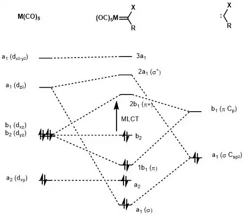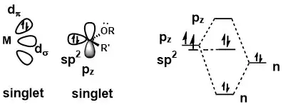 A metal carbene complex could be considered a Fischer carbene when the carbene is in singlet state. Delocalization of the lone pair from the substituent on carbene carbon raises the energy of pz orbital, thus forcing the two of electrons of carbene stay as an electron pair. Bonding between carbene and the metal centre involves a strong σ donation from sp2 orbital to an empty d orbital on metal centre and a weak π back donation from the metal centre to the empty pz orbital. Because the π donation is weak, the carbene carbon is electrophilic in nature.[1]